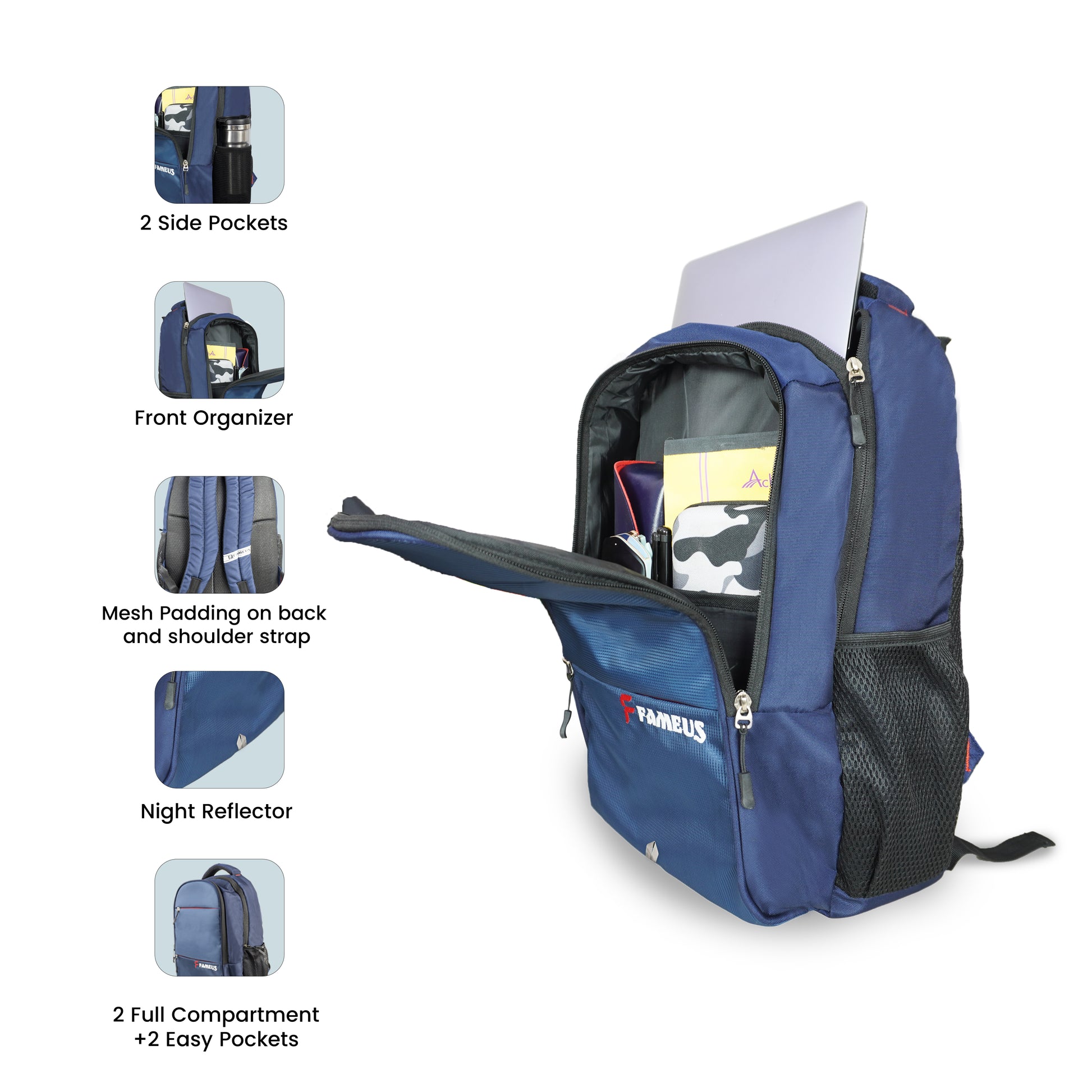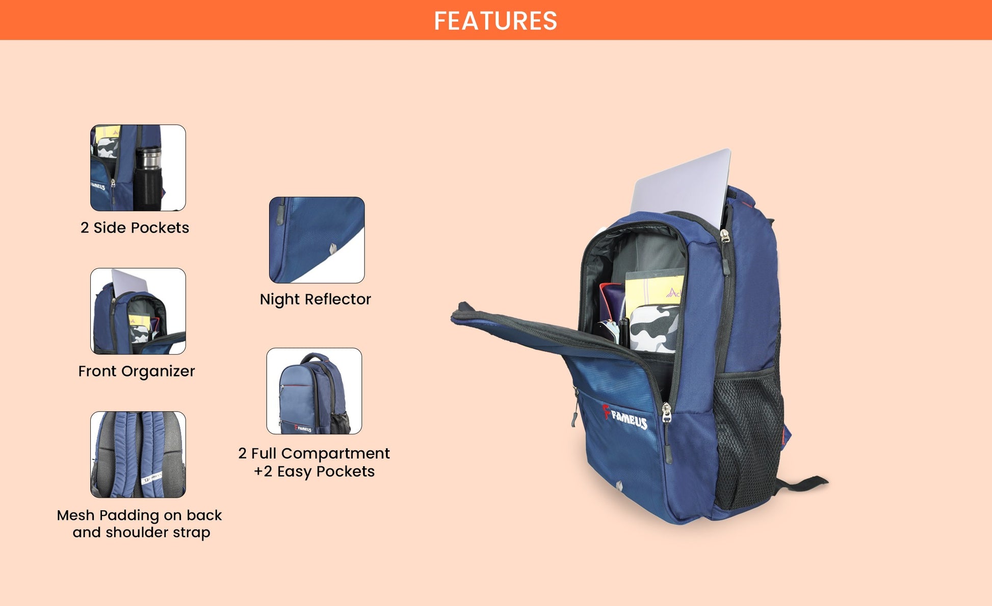 Spacious: There are two large compartments and two front pockets as a system for your phone, tablet, wallet, books and stationery. There is also a mesh pocket on each side for a water bottle or umbrella.